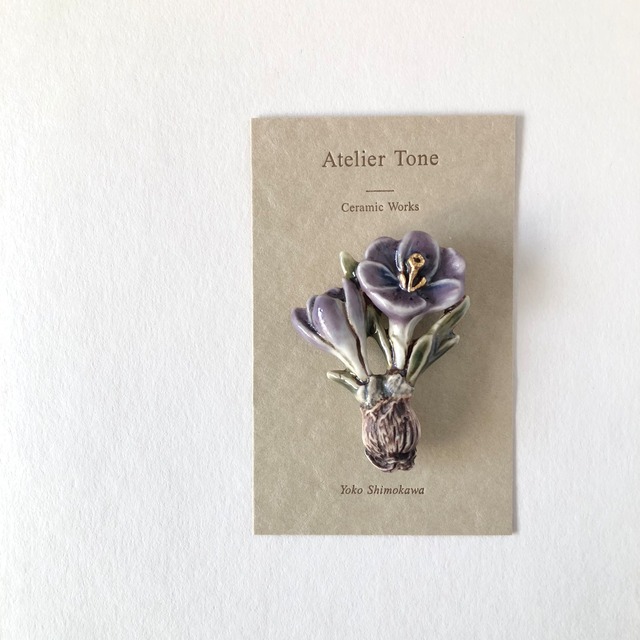 Ceramic Brooch クロッカス/Crocus/Purple Flower language・・・「青春の喜び」「切望」「私を信じて」 クロッカスのブローチです 長い冬を越えて咲くことから、 春の訪れを告げる花として 北欧でも古くから愛されています こちらは紫色の花です 画像はサンプルとなります 釉薬のグラデーションや色合いなど、 それぞれ個体差がありますがご了承ください 縦48×横37mm First created in 2024