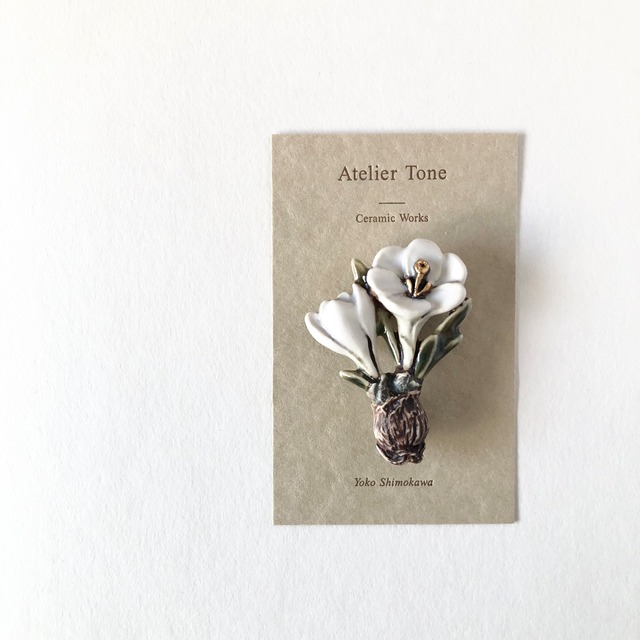 Ceramic Brooch クロッカス/Crocus/White Flower language・・・「青春の喜び」「切望」「私を信じて」 クロッカスのブローチです 長い冬を越えて咲くことから、 春の訪れを告げる花として 北欧でも古くから愛されています こちらは白い花です 画像はサンプルとなります 釉薬の色合いなど、 それぞれ個体差がありますがご了承ください 縦48×横37mm First created in 2024